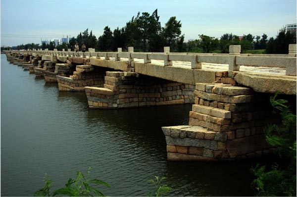 安平橋:屬于中國古代連梁式石板平橋,始建于南宋紹興八年(1138),歷時十四年告成。明清兩代曾多次重修。該橋是中古時代世界最長的梁式石橋,也是我國現存最長的海港大石橋。位于福建省晉江縣的安海鎮,建于宋代,當地人俗稱“五里橋”。橋面由7條大石板鋪成,橋頭有五層六角磚砌成的寶塔一座,此橋為古代跨度最大的梁式石橋,有“天下無此長橋”的美稱。