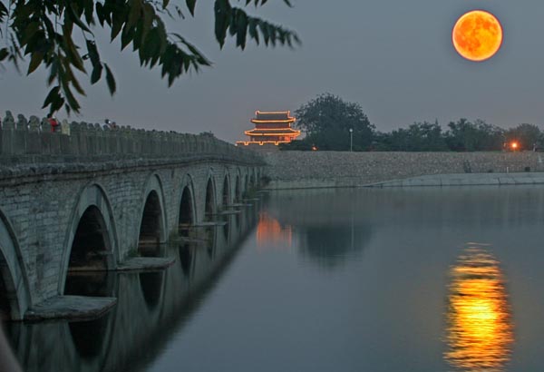 盧溝橋:始建于金大定二十九年(1189年),明正統九年(1444年)重修。清康熙1697年時毀于洪水,康熙三十七年(1698年)重建,坐落在北京廣安門西南約10公里之處,該橋因跨越在盧溝河上(今永定河)因而得名盧溝橋,是北京市現存最古老的石造聯拱橋。盧溝橋全長266.5米,寬7.5米,最寬處可達9.3米。有橋墩十座,共11個橋孔,整個橋身都是石體結構,關鍵部位均有銀錠鐵榫連接,為華北最長的古代石橋。全橋均用白石建成,兩邊石欄雕柱各140根,石柱頭上雕有蹲伏形態各異石獅子485只。
