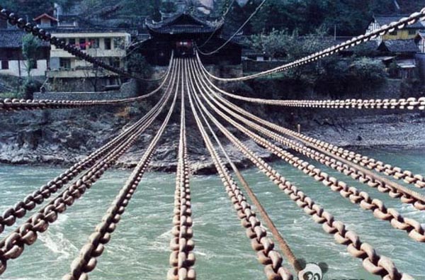 鐵索橋:中國現存的古老鐵索橋之一。又稱瀘定橋。位于四川省瀘定縣城西,跨越大渡河。清康熙四十四年(1705 )九月動工,次年四月完工。橋凈跨 100 米,凈寬 2.8 米,橋面距枯水位 14.5 米。全橋共用鐵索鏈 13 根,,鐵鏈粗如碗口, 每根長150米左右,重約一噸,其中 9 根用作承重底索,上覆橫縱木板作橋面,可通行人、畜; 4 根用作扶手,布置在橋面兩側。
