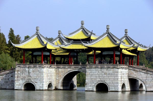 五亭橋:建于乾隆二十二年(1757年),是仿北京北海的五龍亭和十七孔橋而建的,位于江蘇揚州瘦西湖內,橋基由12條大青石砌成,橋身為拱圈形。上建五亭、下列四翼,橋洞正側凡十有五,由3種不同的圈洞聯合,共有15孔,孔孔相通,橋上置有五亭,而且亭與亭之間又以廊相連。既有南方之秀,也有北方之雄。